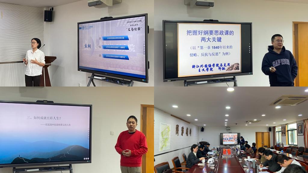 本次分别由赵春兰、印驰和郑宇龙三位年轻教师开展课堂教学展示,其中赵春兰老师做了题为《 全球体系与地方市场有效链接的“义乌经验”》的教学展示,她将自身的课题研究作为教学案例融入课堂的教学,以义乌作为中国发展的典型案例,引导学生去分析思考中国经济发展的现状;印驰老师做了题为以《把握好纲要思政课的两大关键》的教学展示,结合教材1840年以来侵略、反抗与反思为例,提出了思政课教学要把握好7个方面的教学关键问题,以及纲要课教学要把握好的4个关键元素,从而提升学生学习效果;郑宇龙老师做了题为《领悟人生真谛 把握人生方向》的教学展示,他结合教材内容,融入学生服务亚运、参与社会实践等身边案例,充分体现以学生为中心开展思政课教学。