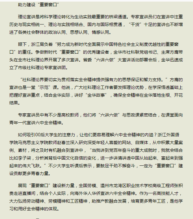 12月20日,浙江日报要闻4版刊发了《把六中全会精神送到家门口——我省“千名专家深入讲”综述》,其中,报道了我校多语种宣讲团宣讲员、马院教师赵春兰依托课堂宣讲十九届六中全会。