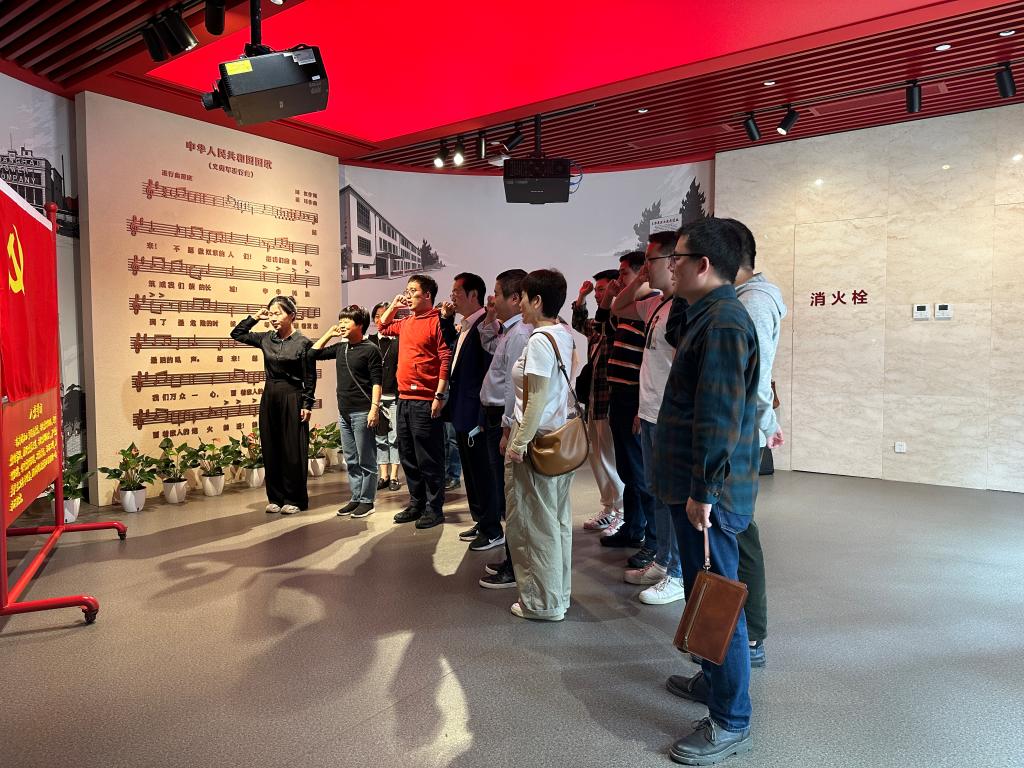 上海国歌展示馆是全国爱国主义教育示范基地。一首国歌,记录着中华民族不屈斗争史和艰辛建设足迹。展示馆通过实物陈列、场景再现、多媒体互动展示等形式,为老师们展示了国歌诞生以来的历史足迹,生动演绎了其从电影《风云儿女》主题曲到成为中华人民共和国国歌的伟大历程及其在新时代的深刻内涵。在展示馆内,党员教师面向庄严的党旗重温入党誓词,以坚定有力的宣誓声,表达不忘初心、牢记使命的信念及决心。