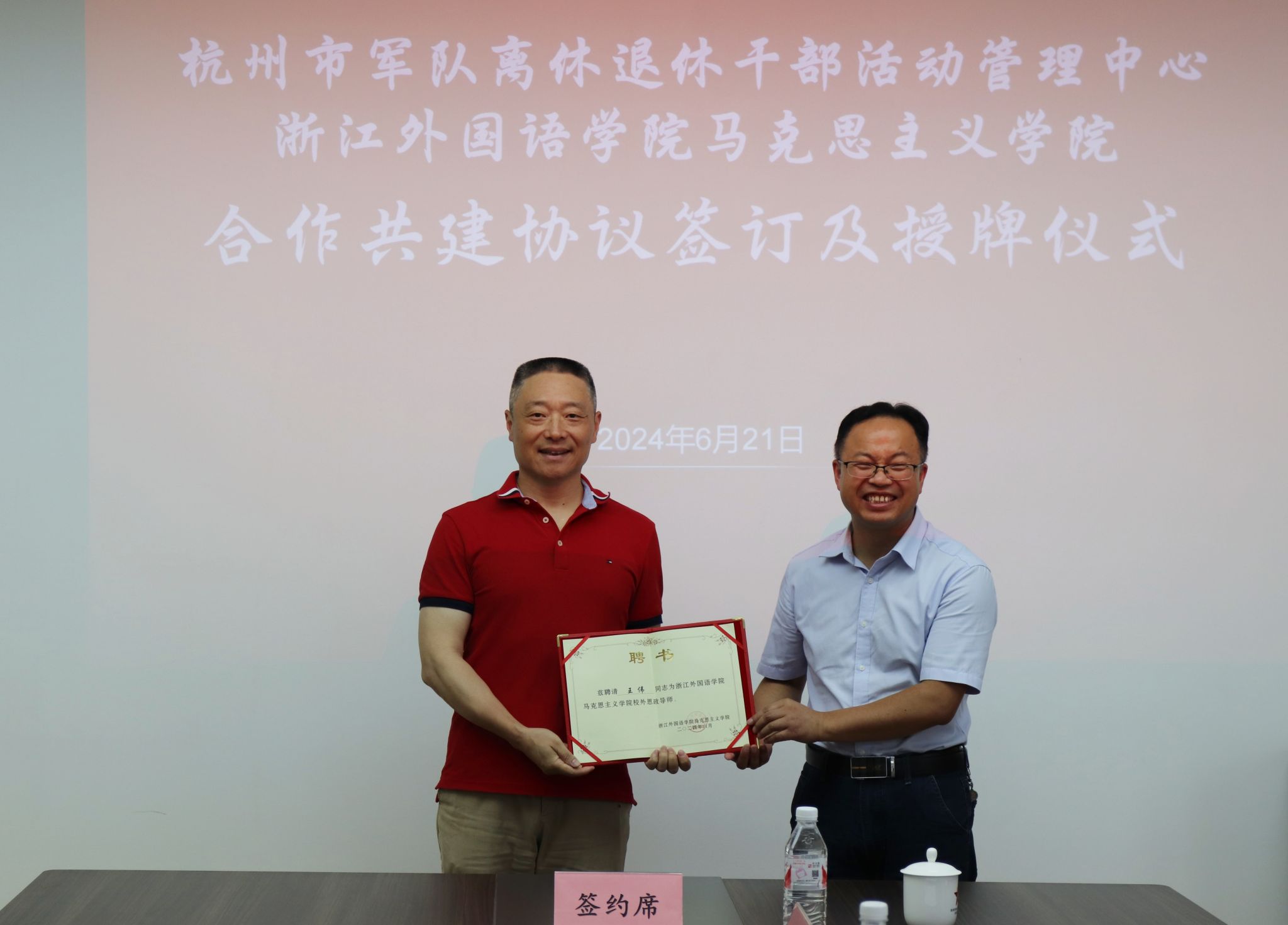 杭州市军队离休退休干部活动管理中心书记、主任韩冰在致辞中,表达了对双方合作共建美好前景的期盼和信心。希望以合作共建签约授牌仪式为起点,深化“红色军休”文化地标、思政基地建设等方面合作,通过强强合作、优势互补,不断扩宽合作形式,形成丰富合作成果,为杭州军休文化高质量发展和浙外马院高质量建设提供有力支撑。