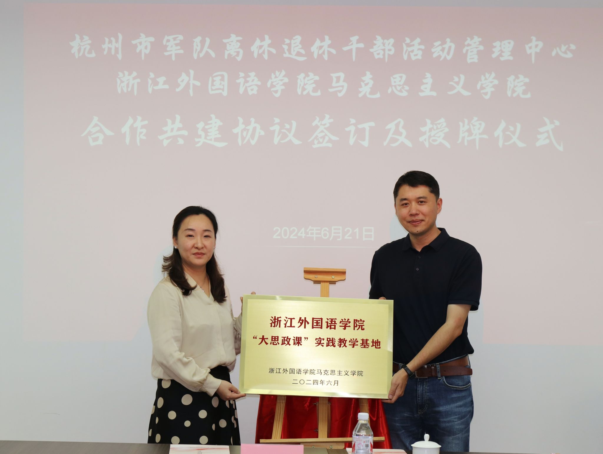与杭州市军队离退休干部活动管理中心举行“红动钱潮”思政教育合作共建签约暨授牌仪式。学院党总支书记毛立峰、副院长方浩,杭州市军队离休退休干部活动管理中心书记韩冰,副主任刘淑兰等出席签订仪式。