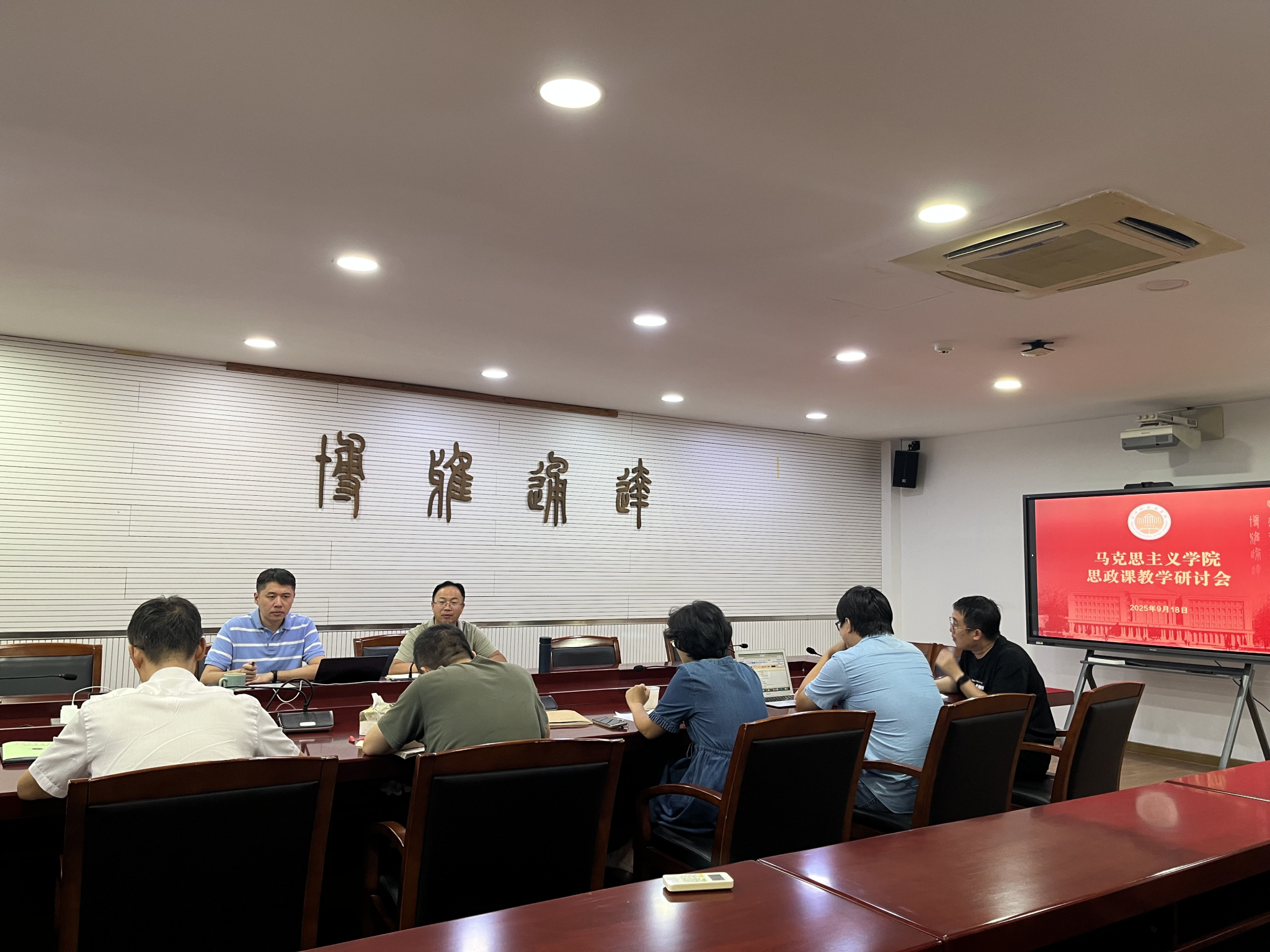 在望A412会议室召开思政课双语教学研讨会,会议由党总支书记毛立峰主持,学院班子、教研室主任、相关教师代表等参加会议。