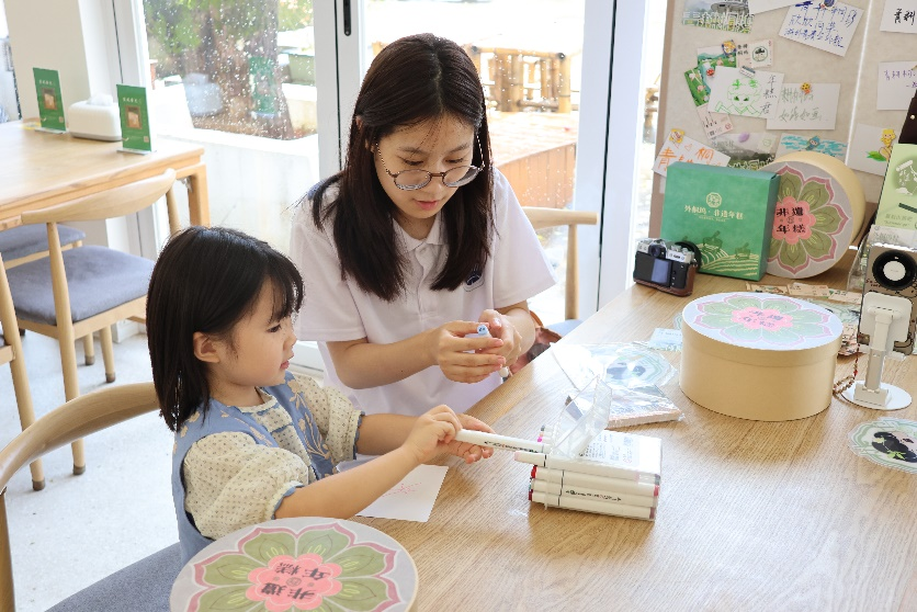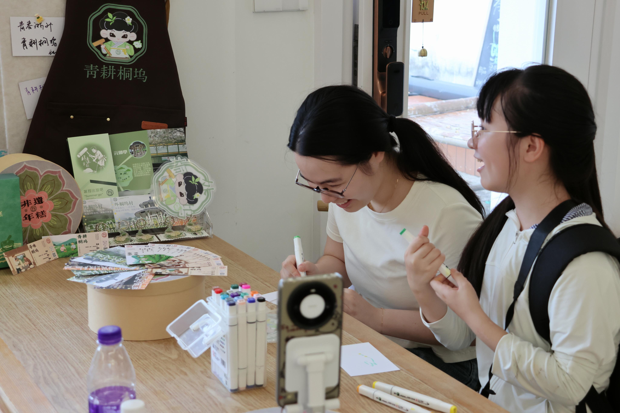 亲子活动区传来阵阵欢笑,多做组家庭正在参与“画说外桐坞”创作。4岁的朵朵举着画好的明信片说:“我要拿着明信片和姐姐们合影!”孩子们用稚嫩的笔触描绘心中的外桐坞村,甚至民宿老板也忍不住参与其中,每幅作品都换得一份团队设计的“桐坞小礼品”。