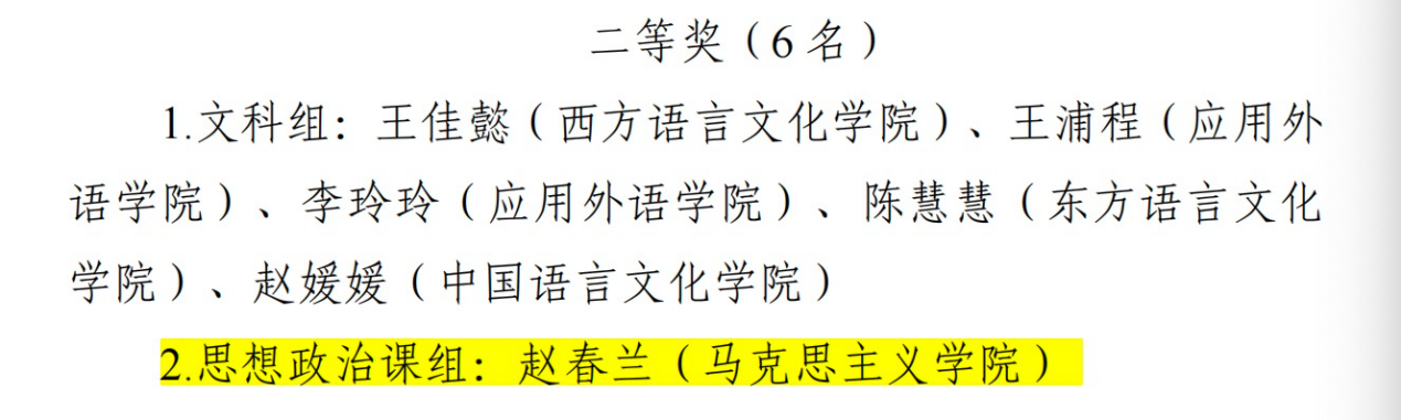 赵春兰老师凭借扎实的学识、巧妙的构思和精彩的表现,展现了马院青年教师良好的教学风采和精神风貌,在为马院赢得荣誉的同时,也对推动思政课程教学改革创新起到积极的促进作用。