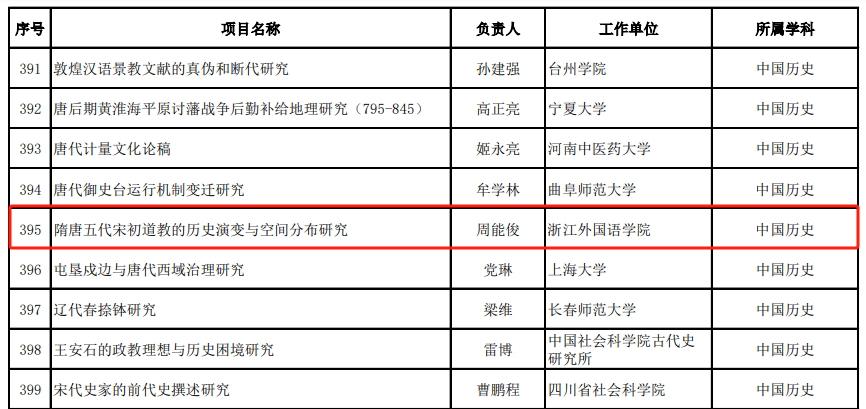 近日,全国哲学社会科学工作办公室按照《国家社会科学基金管理办法》有关规定,公示了2023年度国家社科基金后期资助项目立项名单。其中,51视频 青年教师周能俊的《隋唐五代宋初道教的历史演变与空间分布研究》成功立项。