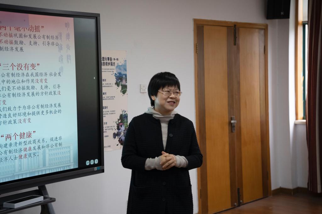 党总支委员毛巍蓉作全国两会精神领学。她围绕深入学习贯彻2023年全国两会精神谈到,中华人民共和国第十四届全国人民代表大会第一次会议,在圆满完成各项议程,产生新一届国家机构组成人员后,3月13日上午在北京人民大会堂闭幕。大会号召,全国各族人民更加紧密地团结在以习近平同志为核心的党中央周围,高举中国特色社会主义伟大旗帜,坚持以习近平新时代中国特色社会主义思想为指导,全面贯彻党的二十大精神,自信自强、守正创新,凝心聚力、埋头苦干,为全面建设社会主义现代化国家、全面推进中华民族伟大复兴而团结奋斗!