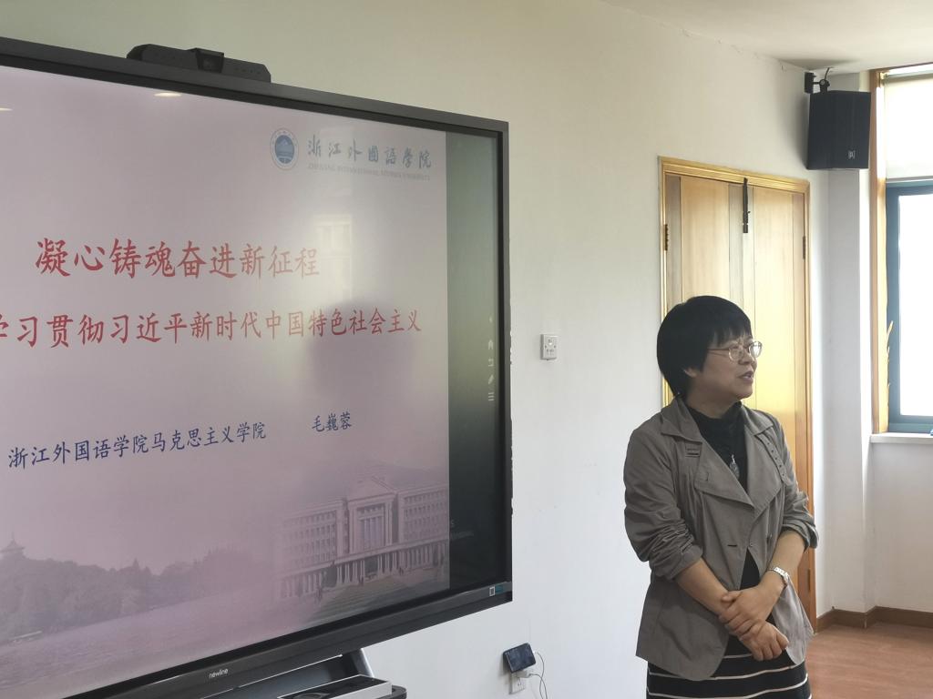 教研室主任兰小平作习近平总书记在广东考察时的重要讲话精神领学。她谈到,习近平指出,广东要朝着民族复兴这个伟大目标,围绕高质量发展这个首要任务和构建新发展格局这个战略任务,在全面深化改革、扩大高水平对外开放提升科技自立自强能力、建设现代化产业体系和推动城乡区域协调发展等方面继续走在全国前列,努力奋进,在推进中国式现代化建设中走在前列。这一重要讲话思想是习近平新时代中国特色社会主义思想在广东的具体化。我们要全面学习领会、整体贯彻落实,深刻领悟“两个确立”的决定性意义,增强“四个意识”、坚定“四个自信”、做到“两个维护”,切实用以统一思想、统一意志、统一行动,奋力书写中国式现代化的浙江篇章。