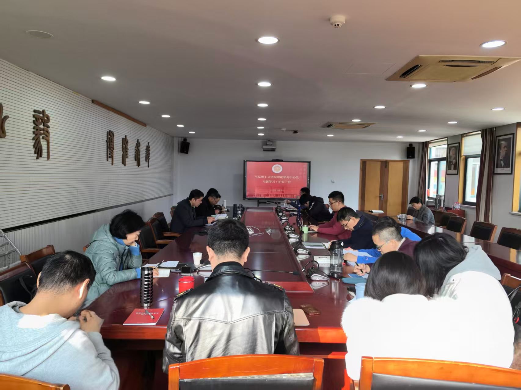 理论学习中心组举行专题学习(扩大)会,学习习近平法治思想、浙江省委十五届八次全会精神。会议由党总支书记毛立峰主持,学院理论中心组成员、全体党员教师参加。